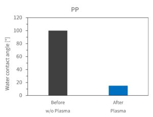 未処理のPPは水接触角が約90〜100°と非常に疎水的ですが、大気圧低温プラズマ処理後には20°程度まで低下し、明確な親水化効果が得られます。