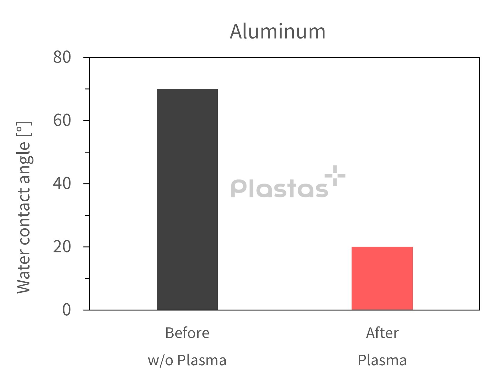 下図は、アルミニウム試験片に対して大気圧低温プラズマ処理を行った前後の水接触角を比較した例です。
