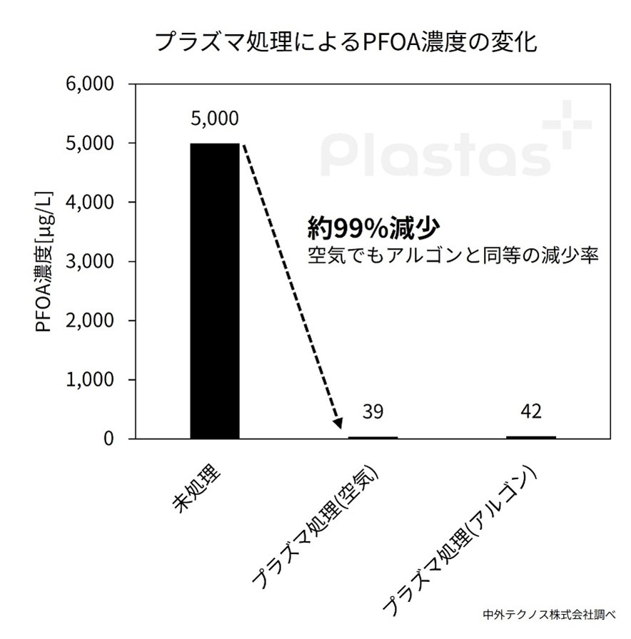 PFOAを5,000 μg/L含む水溶液に対して30分間の大気圧プラズマ照射を行った結果、処理後の濃度は39 μg/Lまで低減し、約99%の分解が確認されました(中外テクノス株式会社調べ)。